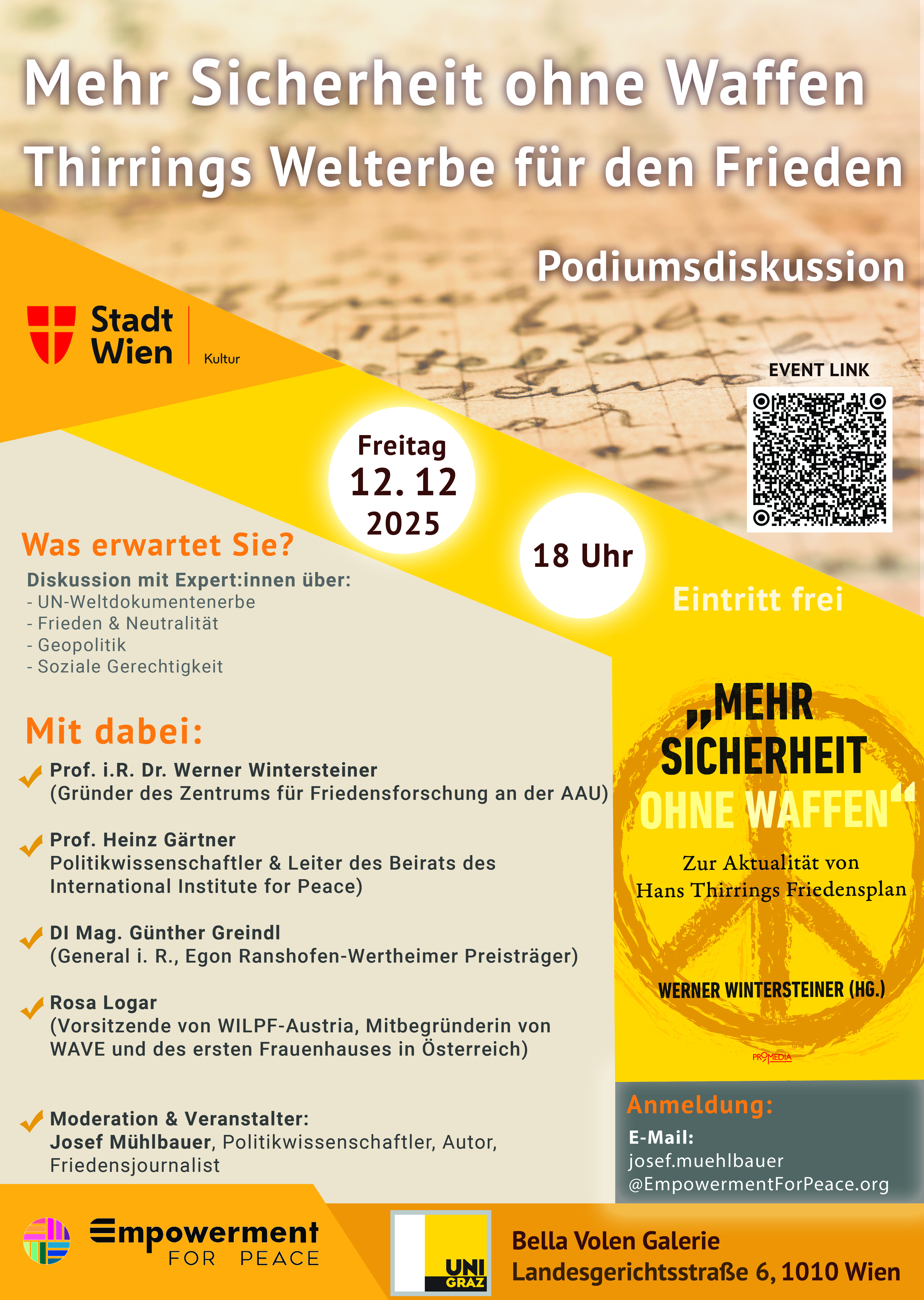 Diese Frage steht im Zentrum einer besonderen Podiumsdiskussion, die anlässlich des „Weltdokumente-Erbes für den Frieden“ von Hans Thirring stattfindet. Sie führt Expertinnen und Experten aus Wissenschaft, Friedensforschung und feministischer Friedensarbeit zusammen – moderiert vom Friedensforscher Josef Mühlbauer.