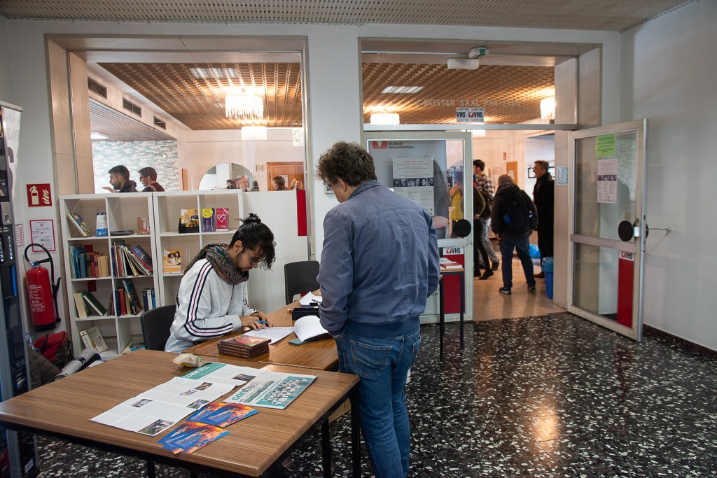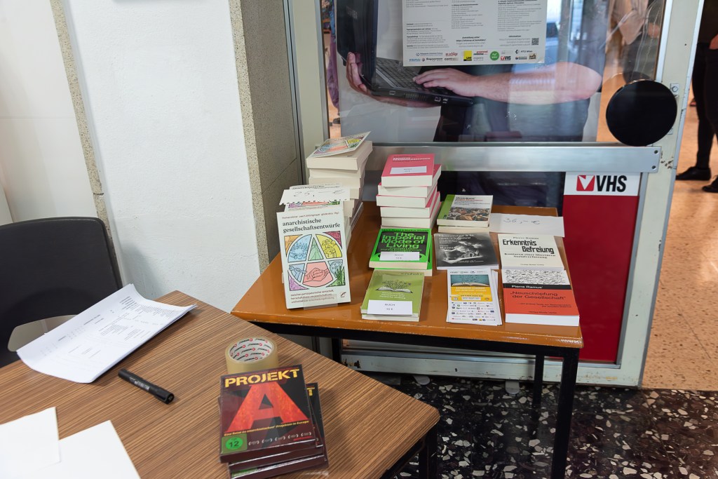 Ein beliebter Treffpunkt und Ort des Austauschs waren die Büchertische, an denen themenrelevante Literatur, darunter auch der Tagungsband „Anarchistische Gesellschaftsentwürfe“, angeboten wurde. Die Besucher:innen zeigten sich davon und von der gesamten Tagung begeistert. Die Stimmung war durchweg positiv, geprägt von einem konstruktiven Geist des gemeinsamen Lernens und der Vernetzung. Die Mischung aus fundierten Vorträgen, interaktiven Formaten und künstlerischen Darbietungen machte diese Tagung zu einem einprägsamen und inspirierenden Ereignis auf dem Weg zu einer gerechteren Zukunft.
