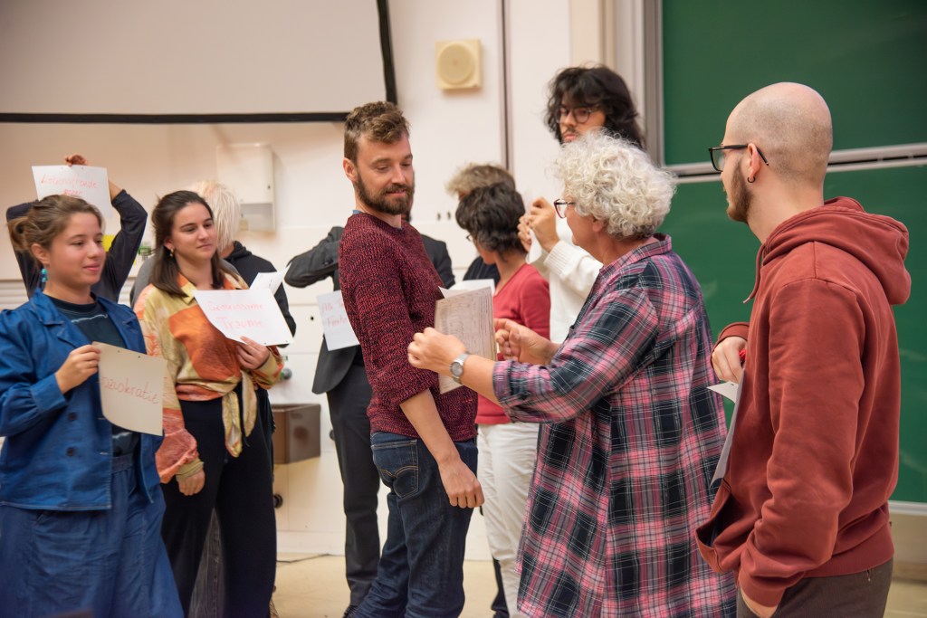 Der Nachmittag war geprägt von einem lebendigen „World Cafe“, moderiert von der Philosophin und Autorin MMag. Utta Isop, in dem gemeinsam mit zahlreichen Aktivist:innen, Menschen aus der Zivilgesellschaft und Wissenschaftler:innen Wege zum Abbau von Herrschaft und Hierarchien diskutiert wurden. Themen wie Ernährungssouveränität und FoodCoops wurden intensiv besprochen. Den Abschluss des ersten Tages bildete ein beeindruckendes Theaterstück des Dada Zirkus.